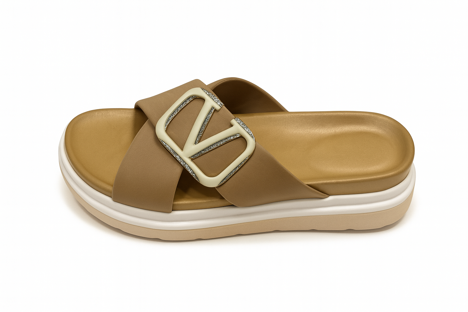 Experience everyday ease with the ZivaWalk Beige Buckle Cross-Strap Comfort Sliders. These sliders combine a soft beige faux leather upper with a cushioned sole for lasting comfort. The crystal buckle adds a subtle touch of style, while the lightweight, flat design ensures all-day wearability. Perfect for pairing with casual or semi-casual outfits, they bring simple elegance to your daily look.
