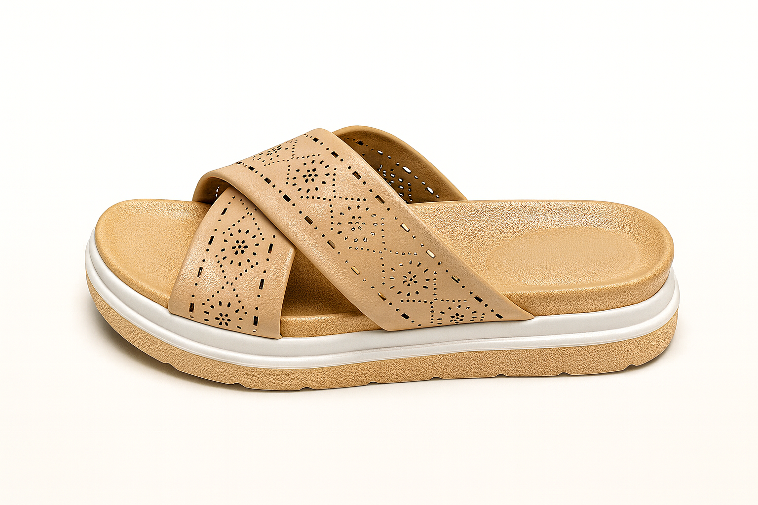 The Beige Comfort Cross-Strap Sandals from ZivaWalk offer soft faux leather straps with laser-cut patterns for a stylish yet simple look. Their cushioned insole and flat, anti-slip sole provide all-day comfort and stability. Easy to slip on, these sandals suit everyday activities like work, errands, or casual outings. They pair well with jeans, dresses, or abayas, making them a versatile addition to your wardrobe. Designed for comfort and ease, they are perfect for the modern woman’s daily wear.