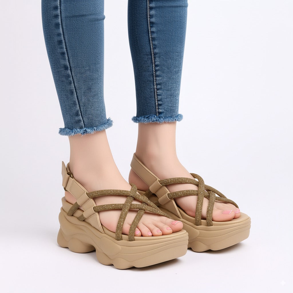 Step out confidently with the ZivaWalk Beige Metallic Crisscross Chunky Platform Sandals. Featuring comfortable cushioned soles and secure metallic straps, these sandals add stylish height with their chunky platform while keeping you steady. Perfect for casual days or festive events, they complement dresses, denim, and more. Designed for women who want fashion and comfort in one easy step.
