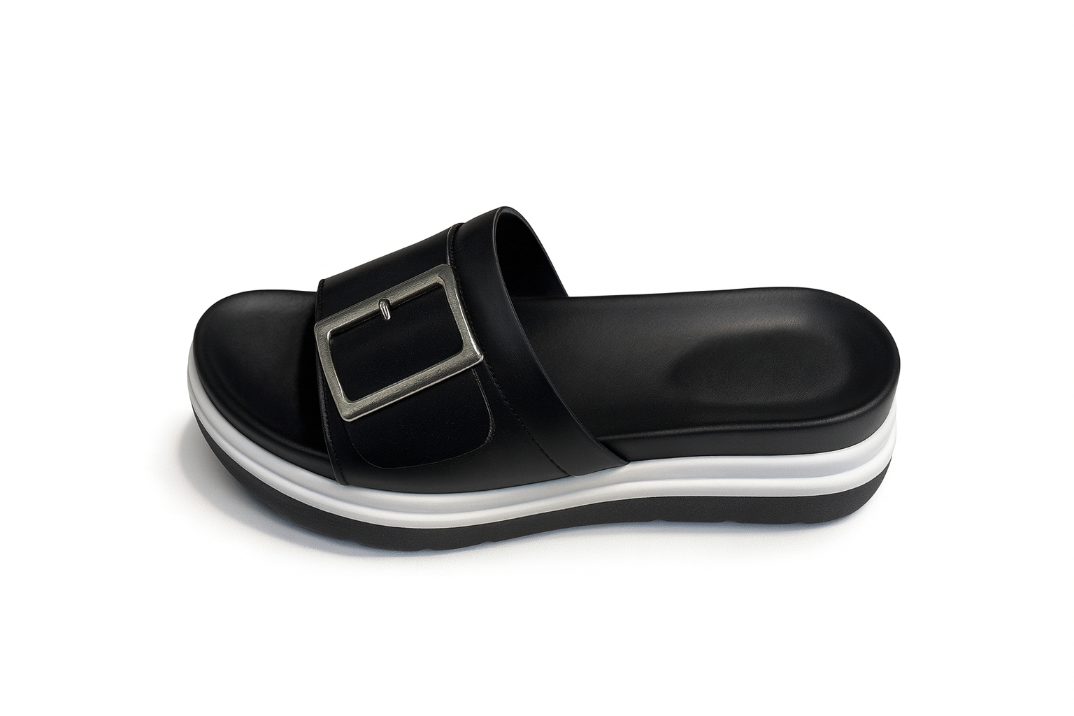 Step into comfort and style with the Black Buckle Comfort Slide Sandals from ZivaWalk. These sandals feature a wide strap with a bold metallic buckle and a cushioned footbed for all-day ease. The lightweight sole adds comfort while the black-and-white contrast gives a modern look. Ideal for casual outings, travel, or relaxing evenings, they pair well with jeans, shorts, or dresses and provide a relaxed, true-to-size fit.