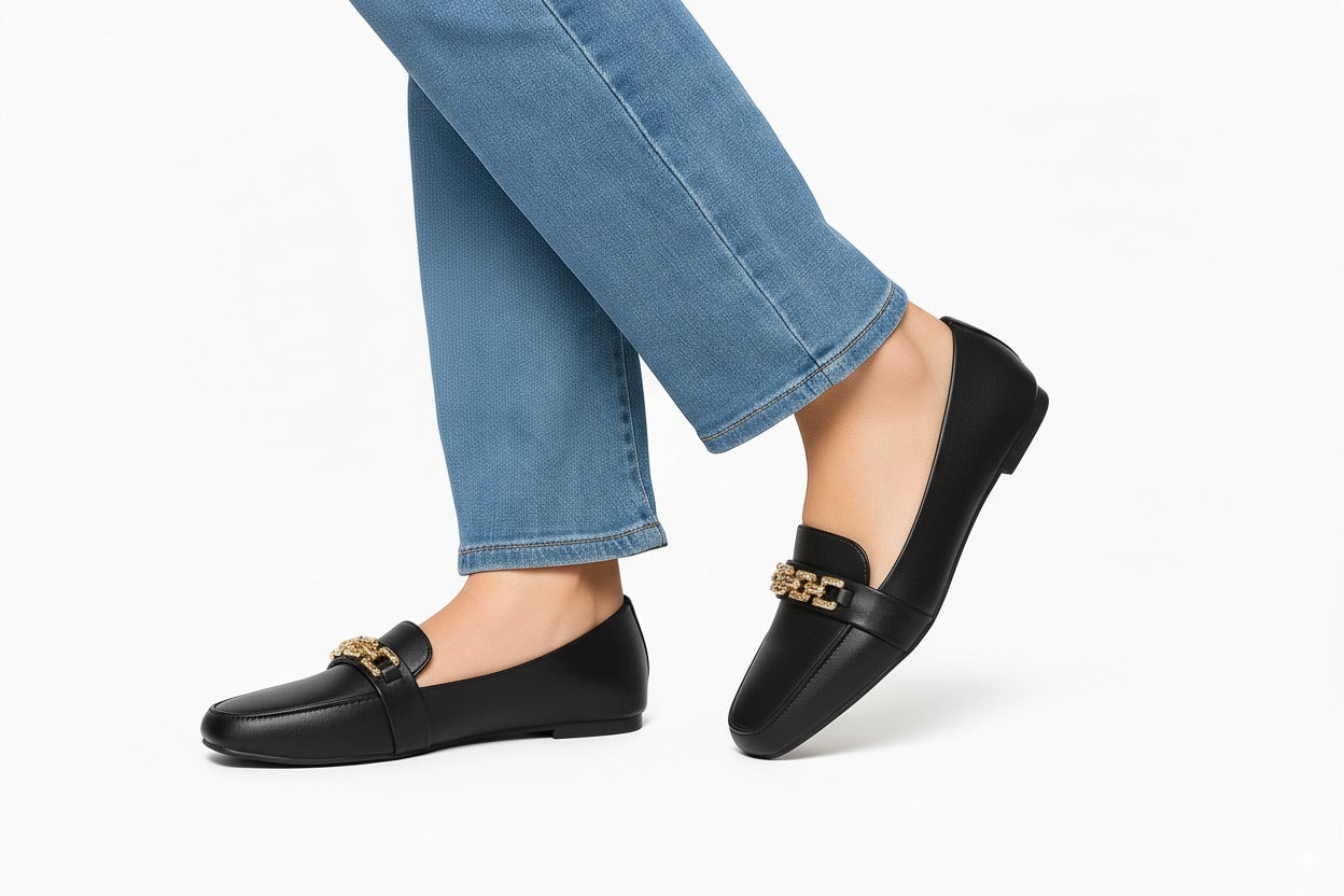 The ZivaWalk Black Chain Accent Loafers offer a stylish and comfortable option for daily wear. Made from premium faux leather with a flat, flexible sole, they feature a chic gold chain detail that adds a touch of elegance. Easy to slip on and true to size, these versatile loafers work well with office outfits, casual looks, and festive wear.
