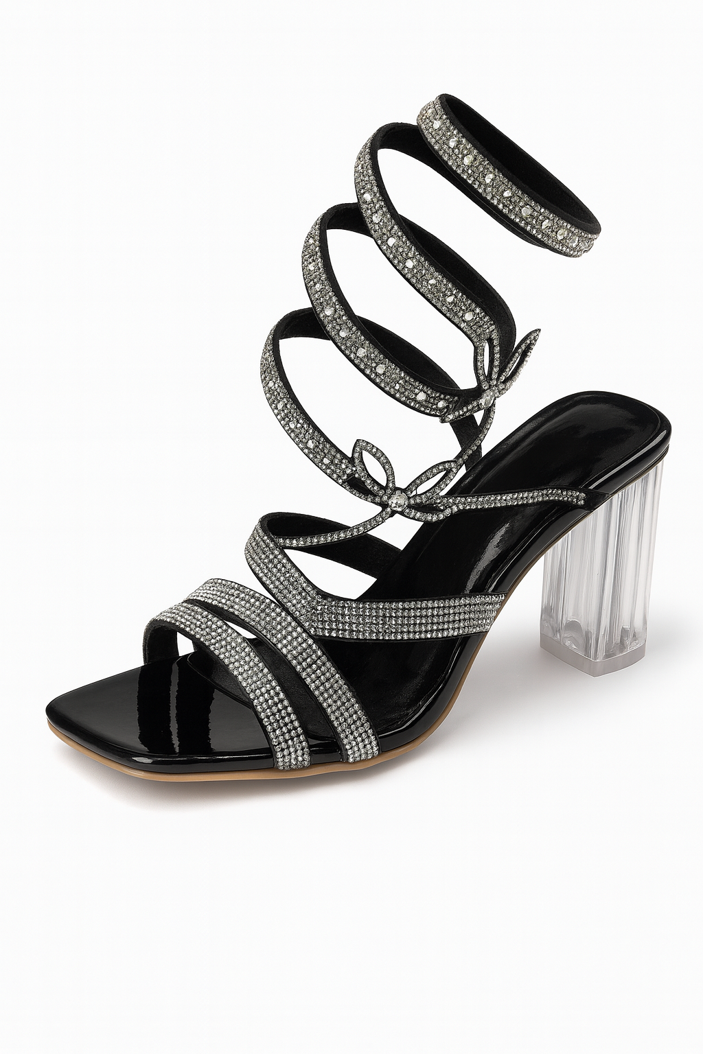 Step out with confidence in the Black Spiral Crystal Strap Block Heels by ZivaWalk. These heels feature sparkling crystal straps that wrap elegantly around your ankle, accented with delicate butterfly touches. Their comfortable cushioned footbed and sturdy transparent block heel offer both style and support. Perfect for special occasions, they pair beautifully with gowns and dresses, making you feel glamorous and secure all night long.