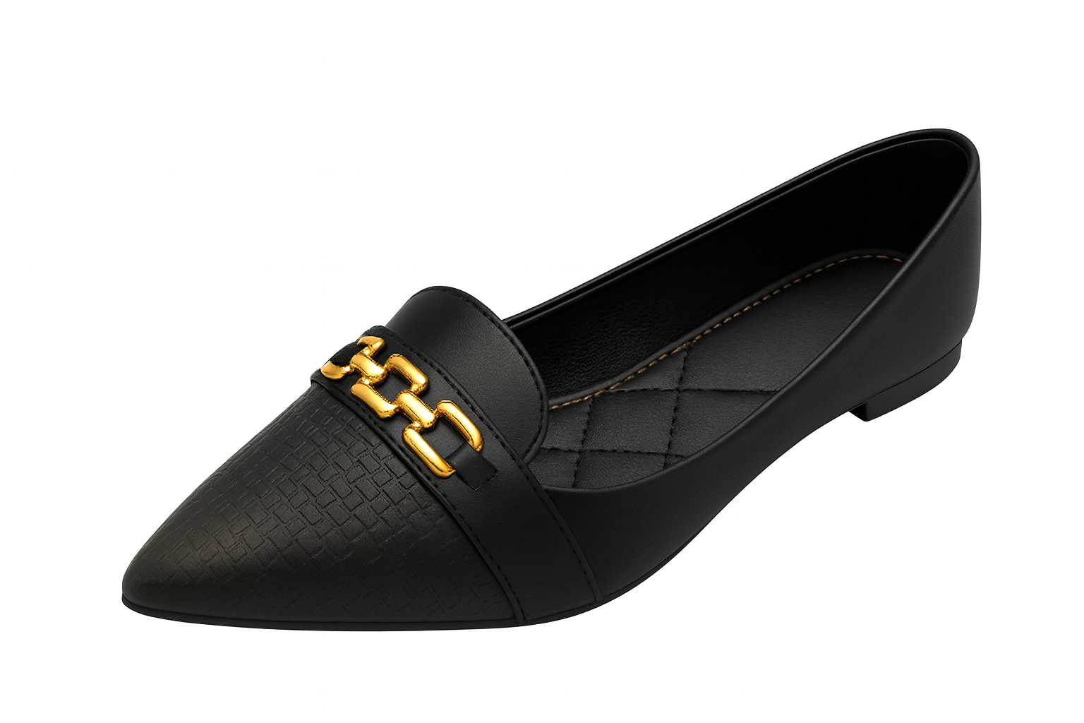 The Black Textured Pointed-Toe Loafers combine style and comfort with a sleek pointed toe and textured front. They feature a quilted insole for cushioned support and a polished gold chain accent for a touch of elegance. Made from premium faux leather with a flexible, anti-slip sole, these flat loafers are easy to slip on and ideal for work or special occasions. Designed to fit true to size, they offer all-day comfort without sacrificing sophistication.