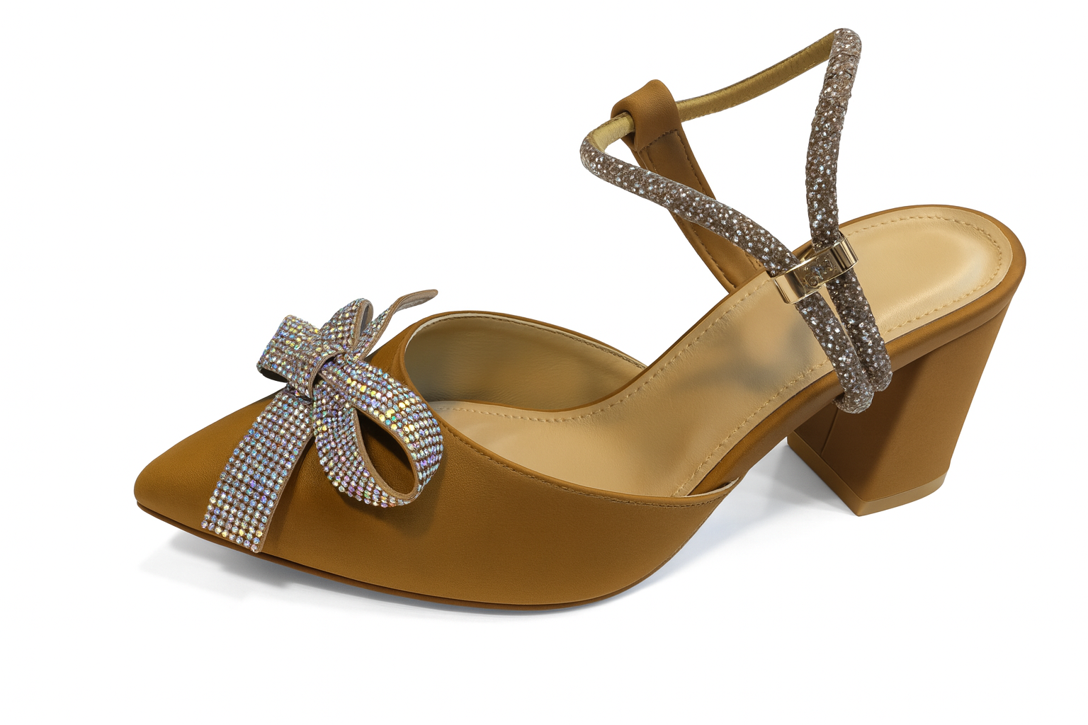 Step into elegance with ZivaWalk’s Caramel Bow Crystal Embellished Block Heels. Featuring a soft caramel-golden satin finish and a sparkling oversized crystal bow, these heels combine style with comfort. The dual embellished straps and mid-height block heel ensure a secure fit and all-day wearability. Perfect for weddings and festive events, they add a touch of glamour to both traditional and modern outfits. Comfortable, stylish, and made to boost your confidence with every step.