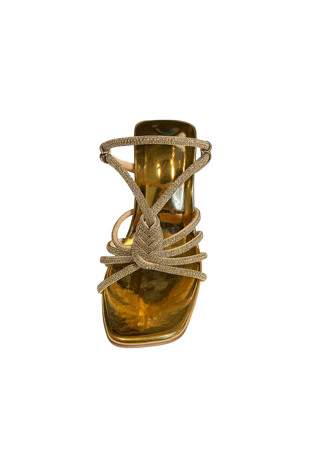 The Golden Knot Strap Crystal Sandals feature braided knot straps and sparkling crystal details on a golden block heel. Comfortable and stylish, they are perfect for weddings, parties, and special occasions. Adjustable ankle straps ensure a secure fit, making them easy to wear all day or night. These sandals complement both traditional and modern outfits beautifully.