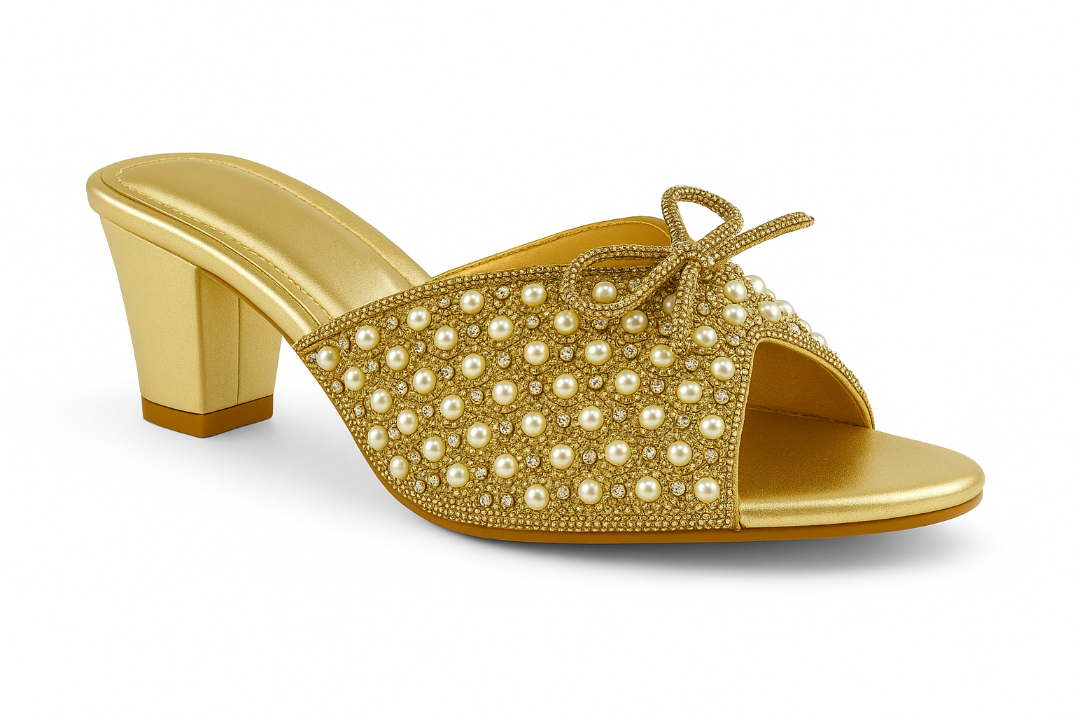 Step out in style with the ZivaWalk Golden Pearl Bow Embellished block heels. Featuring a gold base decorated with pearls and crystals, these 2.5-inch heels combine elegance with comfort. The cushioned insole and stable block heel support your feet, while the anti-slip sole keeps you steady. Perfect for weddings and festive occasions, they complement ethnic and formal wear beautifully. Designed to help you feel confident and comfortable all day long.