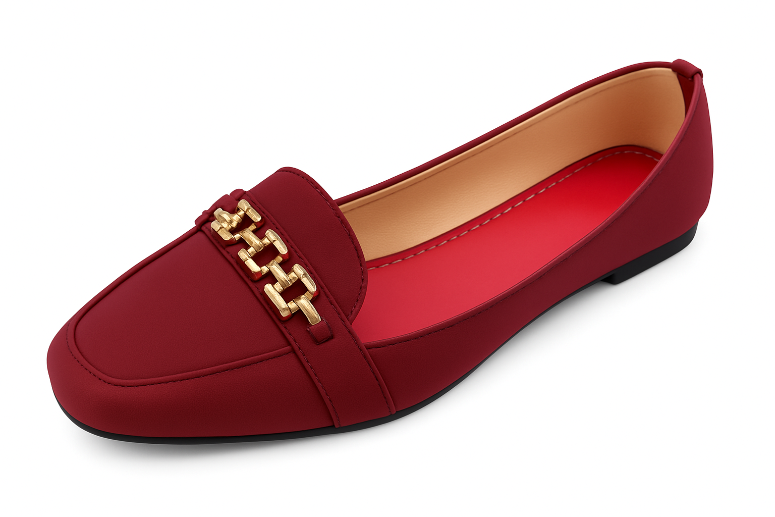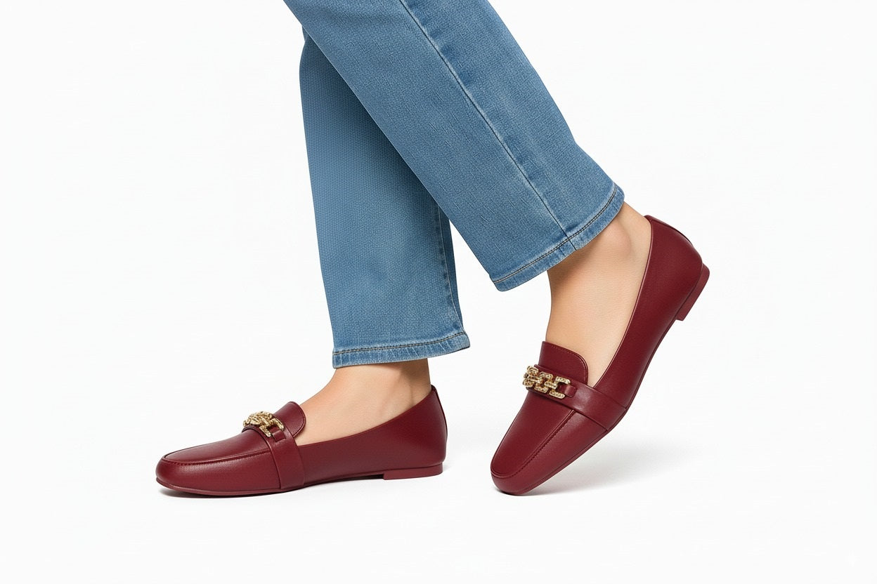 The Maroon Chain Accent Loafers by ZivaWalk offer a simple, stylish look with a comfortable fit. Made from premium faux leather in a rich maroon shade, they feature a gold chain detail and a cushioned insole for all-day comfort. Their slip-on design and anti-slip sole make them easy to wear and safe for various occasions. Perfect for work or special events, these flats pair well with both traditional and modern outfits.