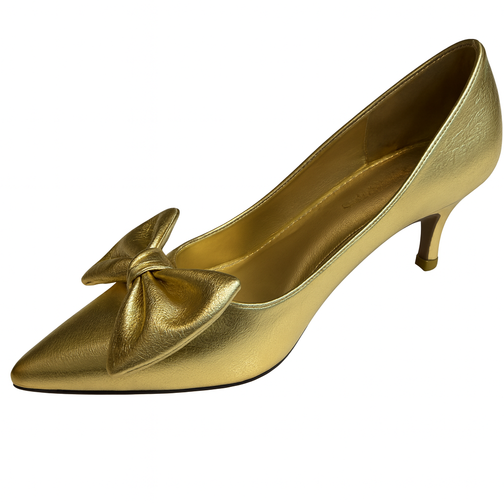Shine with the ZivaWalk Metallic Gold Bow Stiletto Heels, perfect for adding a touch of glamour to any outfit. These heels feature a sleek pointed toe with a stylish bow and a comfortable mid-height stiletto heel. Designed for weddings, parties, and special occasions, they pair beautifully with both traditional and modern styles. Made from premium metallic synthetic leather with an anti-slip sole, they offer a secure and true-to-size fit to keep you confident all day or night.