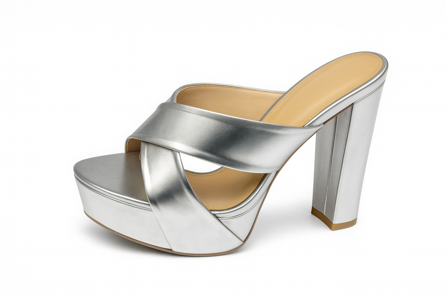 The ZivaWalk Silver Metallic Platform Block Heels combine stylish metallic crossover straps with a stable chunky heel, around 4.5 to 5 inches high. Designed for comfort with a cushioned insole and an anti-slip sole, they support long wear. Perfect for parties and special occasions, these heels add bold height and shine to your outfit, helping you walk with confidence and style.