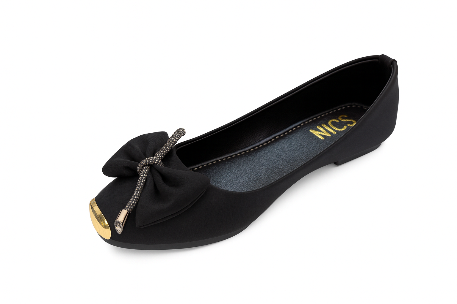 The Midnight Luxe Bow flats by ZivaWalk are stylish and comfortable in classic black. They feature a bold bow with metallic tips and a golden toe accent. Made from soft synthetic leather with a cushioned insole, they provide comfort for all-day wear. Their flat, anti-slip sole and true-to-size fit make them perfect for work, special events, or casual outings. These versatile flats easily complement both traditional and modern outfits, helping you walk with confidence and style.