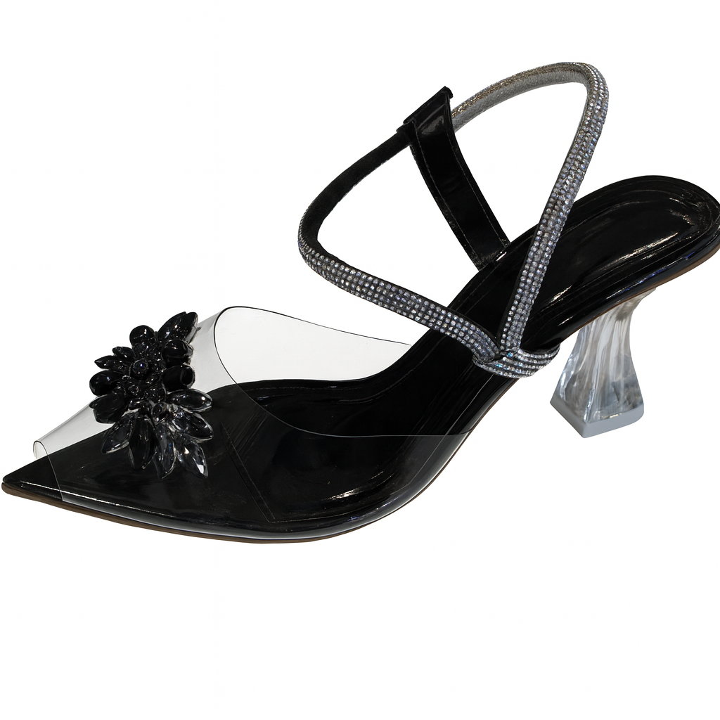 Step into elegance with the ZivaWalk Midnight Crystal Embellished Heels. Featuring black synthetic material, clear block heels, and sparkling rhinestone straps, these 3-inch heels offer a comfortable, true-to-size fit with anti-slip soles. Perfect for evening events and special occasions, they add a touch of bold glamour to any outfit.