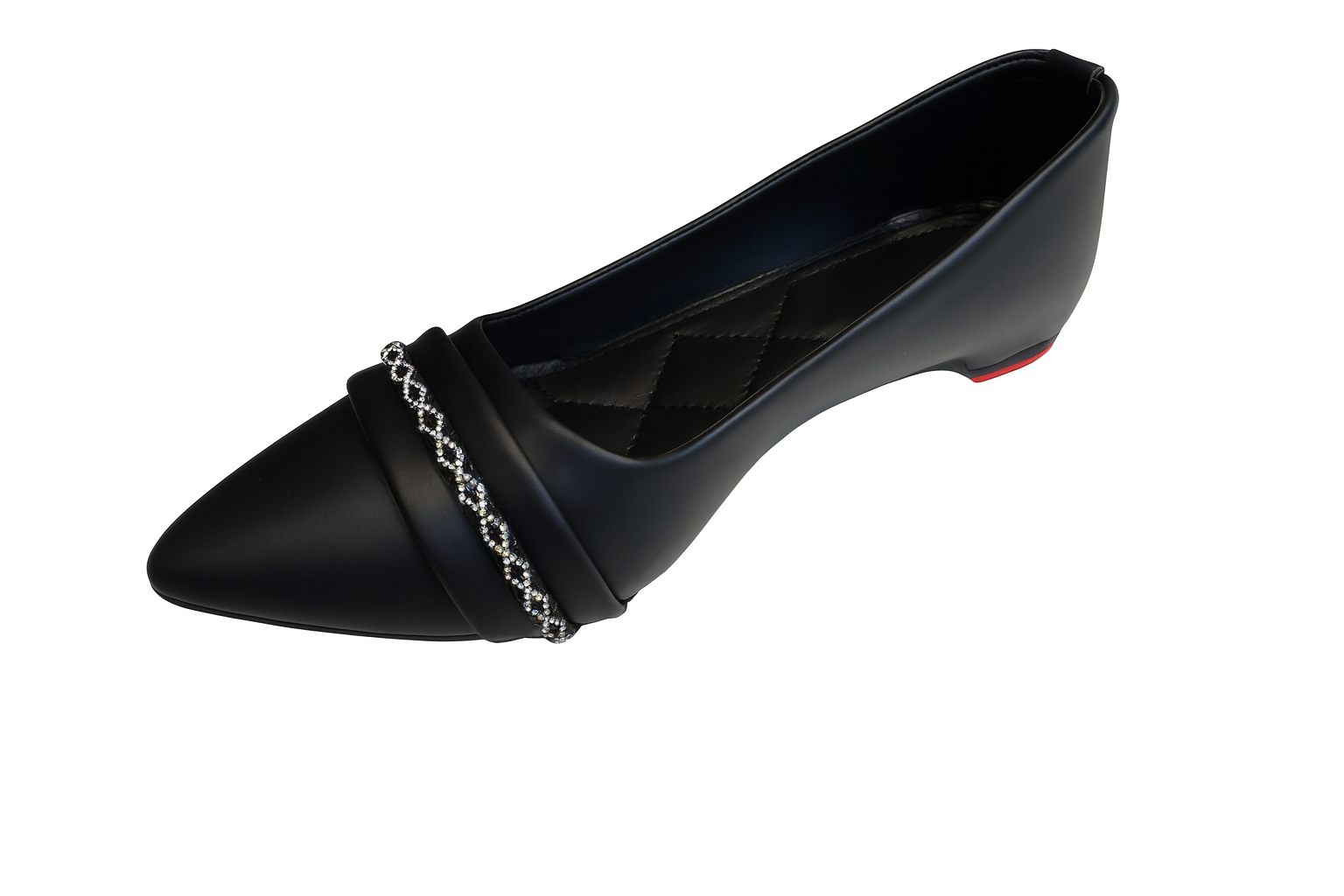 Step into comfort and style with the ZivaWalk Noir Crystal Chain Embellished Flats. These sleek black flats feature a pointed toe and a delicate crystal chain for a touch of sparkle. With a cushioned insole and low heel, they offer support for all-day wear. Perfect for work, casual outings, or semi-formal events, they pair well with pants, dresses, or jeans. Designed to keep you comfortable and confident wherever you go.