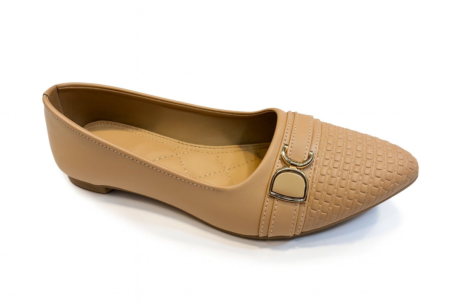 The ZivaWalk Nude Textured Buckle Flats combine a nude beige shade with a subtle embossed pattern for everyday elegance. Featuring a gold-tone buckle, pointed toe, and flat anti-slip sole, these flats offer comfortable, true-to-size wear with a soft cushioned insole. Ideal for work or casual outings, they bring both style and all-day comfort.