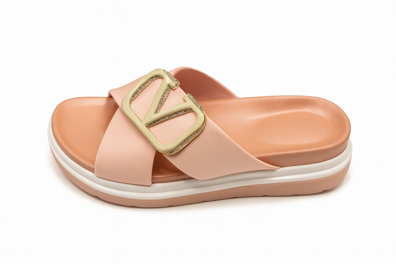 Enjoy everyday comfort and style with ZivaWalk’s Peach Pink Comfort Sandals. These sandals feature soft peach-pink wide straps and a gold buckle for a feminine and elegant look. The cushioned insole and flat, anti-slip sole provide support for all-day wear. Perfect for casual outings or work, they pair well with jeans, dresses, or summer abayas.