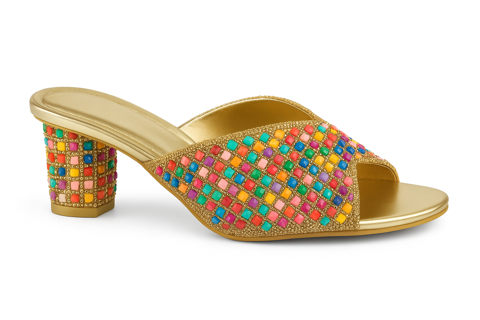Step confidently with the ZivaWalk Radiant Mosaic Embellished Block Heels. Featuring a gold base with colorful stones, these comfortable 2.5-inch block heels offer stable support and an anti-slip sole. Perfect for weddings, parties, or cultural events, they pair beautifully with traditional outfits or casual denim. Designed to make you shine with ease and comfort.
