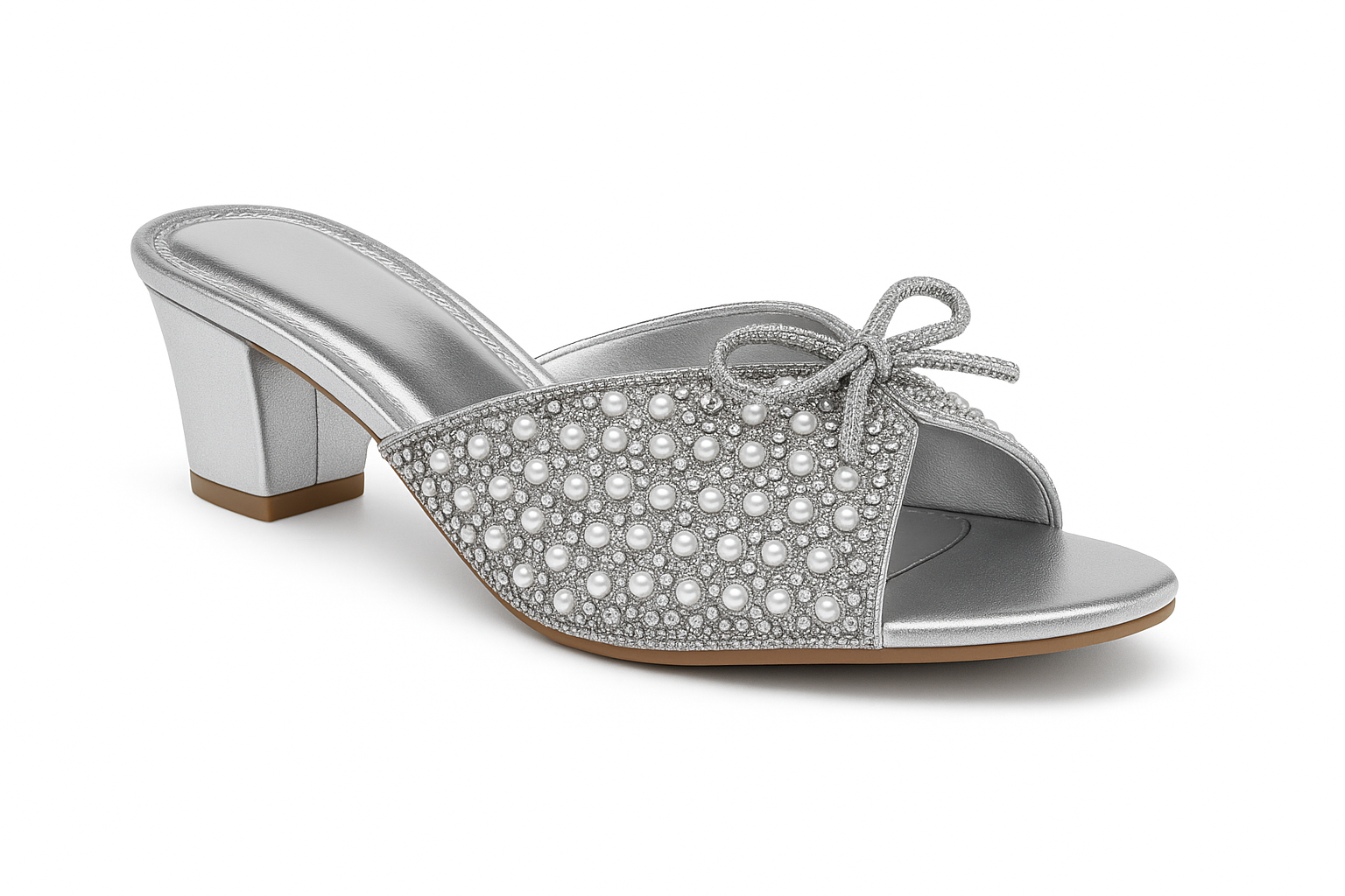 The ZivaWalk Silver Pearl Bow Embellished Block Heels offer elegant style with a comfortable 2.5-inch block heel. Featuring a silver base adorned with pearls and crystals, these shoes provide both glamour and stability. Their slip-on design and cushioned sole make them easy to wear for weddings, parties, and special events. Pair them with your favorite formal outfits for a confident and graceful look.