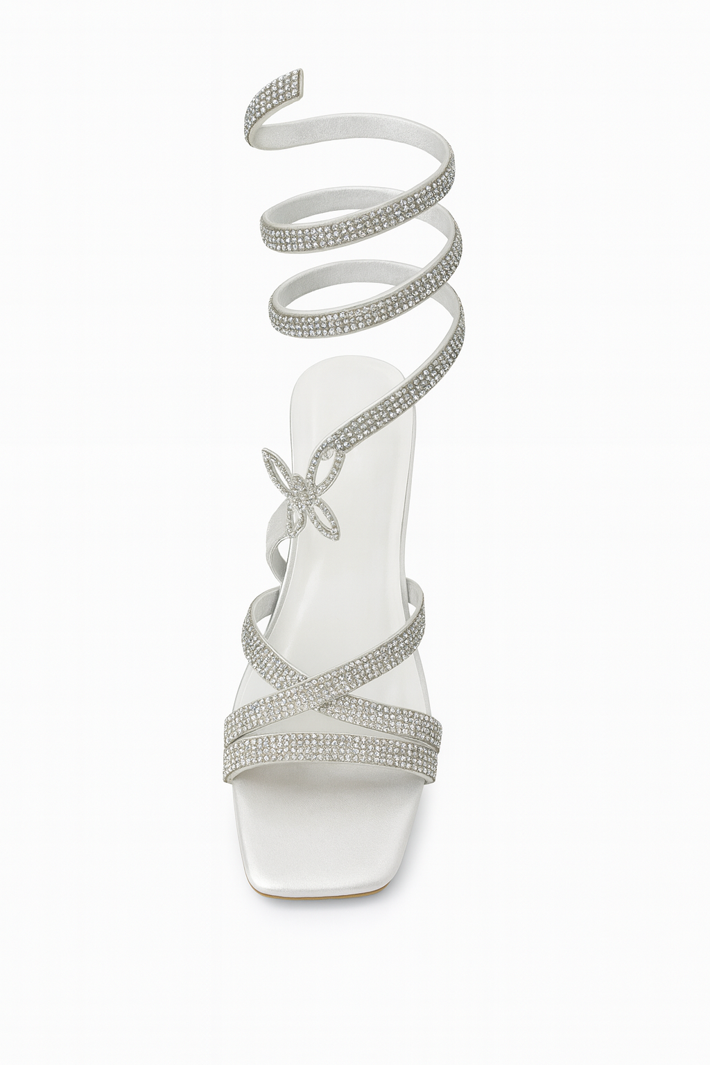 Step confidently in the Silver Spiral Crystal Wrap Heels by ZivaWalk. These elegant heels feature sparkling crystal straps that wrap around your ankle with a graceful spiral design and a charming butterfly detail. With a comfortable cushioned insole and sturdy anti-slip sole, they’re perfect for weddings and special occasions. Their modern square toe and slender block heel provide a stylish yet supportive fit, making it easy to shine all night long.