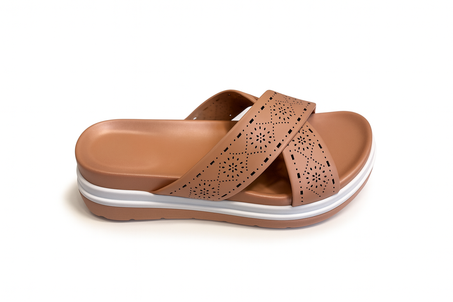 Experience everyday comfort and style with the Tan Brown Comfort Cross-Strap Sandals from ZivaWalk. Made with soft faux leather and cushioned insoles, these sandals offer a secure fit and anti-slip sole for safe walking. Their flat heel and unique laser-cut wide straps make them perfect for casual wear, travel, or errands. Easy to pair with jeans, dresses, or abayas, they combine practicality with a modern look for all-day comfort.